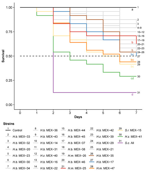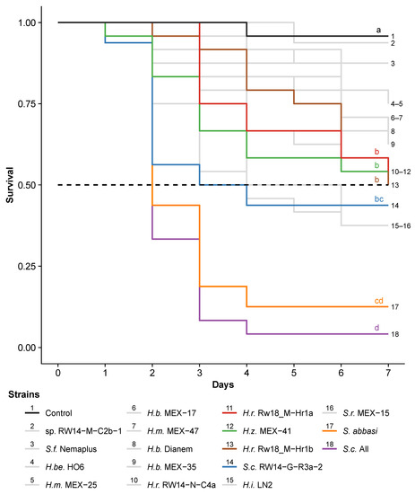 Killing speed of Mexican nematodes strains (MEX) of Heterorhabditis bacteriophora (H.b.), H. mexicana (H.m.), H. zacatecana (H.z.) and Steinernema riobravae (S.r.) when placed with third-instar Spodoptera frugiperda caterpillars in small arenas. Mortality was evaluated over seven days post inoculation with ten infective juvenile nematodes per caterpillar. The commercial nematode Steinernema carpocapsae (S.c.) All was used as positive control. To facilitate readability, only a few highly virulent strains, which were selected for further experimentation, are highlighted in colors. Less virulent strains are represented in grey. The dotted horizontal line represents 50% survival. Letters indicate significant differences (p < 0.05) obtained from multiple comparisons corrected for false discovery using the Benjamini and Hochberg method.