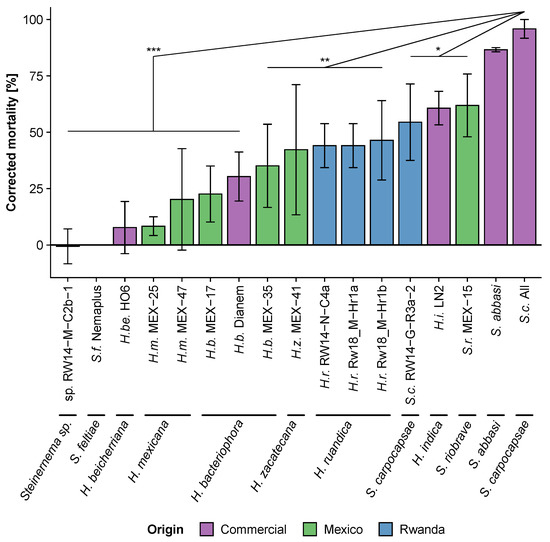 Virulence (mean ± SE) of Mexican, Rwandan and commercial entomopathogenic nematode strains when placed with third-instar Spodoptera frugiperda caterpillars in small arenas. The mortality of individual caterpillars was evaluated seven days post inoculation with ten infective juvenile nematodes per caterpillar. The virulence of each strain was compared to the virulence of the commercial Steinernema carpocapsae strain All, which served as the positive control. Stars (*) indicate significant differences obtained from many-to-one comparisons corrected for false discovery using the Benjamini and Hochberg method (no star: non-significant, *: p < 0.05, **: p < 0.01, *** and p < 0.001).