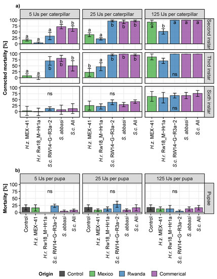Virulence (mean ± SE) of the most promising Mexican, Rwandan and commercial entomopathogenic nematode strains on (a) second-, third- and sixth-instar caterpillars as well as on (b) pupae of Spodoptera frugiperda in small arenas. H. zacatecana (H.z.), H. ruandica (H.r.), Steinernema abbasi and S. carpocapsae (S.c.). Mortality was evaluated seven days post inoculation with either 5, 25 or 125 infective juvenile nematodes per caterpillar (a) or pupa (b). The virulence of each strain was compared to one another using multiple-comparisons corrected for false discovery using the Benjamini and Hochberg method. Letters indicate significant differences (p < 0.05) between treatments (ns = non-significant differences).