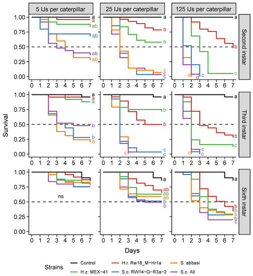 Killing speed of the most promising Mexican, Rwandan and commercial entomopathogenic nematode strains on second-, third- and sixth-instar caterpillars in small bioassay arenas. H. zacatecana (H.z.), H. ruandica (H.r.), Steinernema abbasi and S. carpocapsae (S.c.). The mortality of individual caterpillars was evaluated over seven days post inoculation with either 5, 25 or 125 infective juvenile nematodes per caterpillar. The dotted horizontal line represents a probability of 50% survival. Letters indicate significant differences (p < 0.05) obtained from multiple comparisons corrected for false discovery using the Benjamini and Hochberg method (ns = non-significant differences).