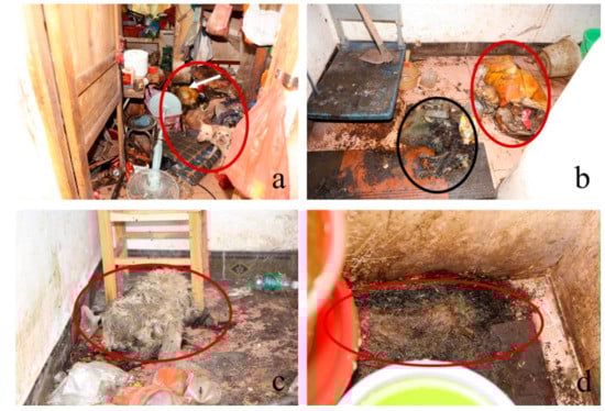 Overview of forensic scene: (a) Woman corpse; (b) Man corpse (red circle) and the carcass of one of the dogs (black circle); (c) Carcass of a dog on the first floor; (d) Carcass of a dog in the toilet on the second floor.