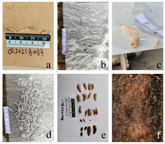 Insects found on corpses and dog carcasses: (a) on the woman corpse; (b,c) on the man corpse; (d) on the dog carcass on the first floor; (e,f) on the dog carcass in the toilet on the second floor.