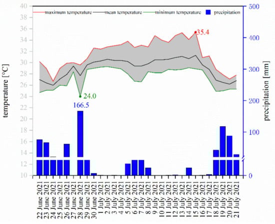 Daily temperature and precipitation change from 22 June 2021 to 21 July 2021.