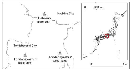 - Riverside road of Ishikawa River in Tondabayashi City (34°30′9″ N, 135°36′50″ E) (hereafter referred to as Tondabayashi 2) from 2020 to 2021 (Figure 1).