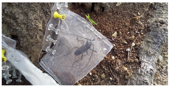 - Urano, T.; Shoda-Kagaya, E. Longevity and lifetime fecundity of rearing adults of Aromia bungii (Coleoptera: Cerambycidae). Kanto J. For. Res. 2017, 68, 25–28. (In Japanese) [Google Scholar]