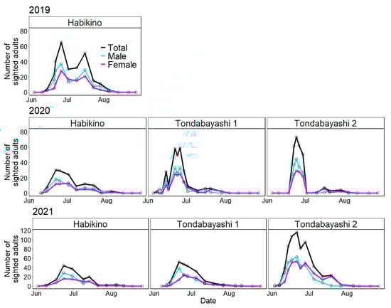 The period from the initial sighting day to the peak day was shorter than the period from the peak day to the last sighting day (e.g., in the 2019 survey; 12 days vs. 40 days); therefore, the distribution based on the number of sighted adults per day was not normal but skewed to the left (abundant in the early phase of seasonal prevalence) (Figure 3). In addition, there were very few or no adults in August for 3 years.