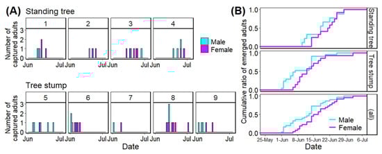 Figure 4 shows the number of A. bungii adults that emerged daily from each infested tree using stacked bar plots (A) and the cumulative ratio of the number of A. bungii adults that emerged from the infested trees via tree types and all trees using stepped line plots (B). Table 2 shows the initial and last emergence dates as well as the emergence period for each tree.