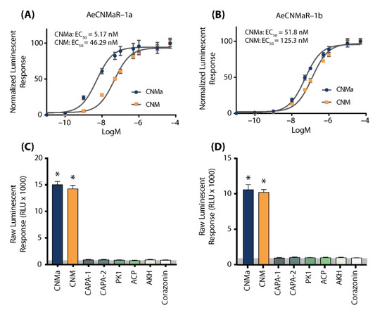 Neither of the receptors were responsive to several other Ae. aegypti peptides tested at 1 µM, which yielded luminescent responses similar to background levels when BSA media alone was applied (Figure S1). Instead, only AeCNMa and AeCNM were able to elicit a significant response several orders of magnitude over the BSA media background luminescent response (Figure S1).