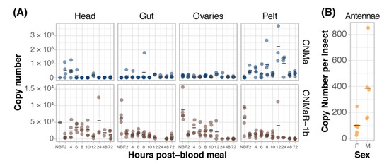 We examined the expression of AeCNMa, AeCNMaR-1a, and AeCNMaR-1b across life stages and in female tissues taken at various times post-blood meal (PBM). Expression of AeCNMaR-1a was never detected in any juvenile-stage or female samples. AeCNMa and AeCNMaR-1b were expressed at varying levels across tissues and development. We found elevated AeCNMa expression at 2–4 h PBM in heads (F9,32 = 3.36, p = 0.0052, ANOVA) and in pelts beginning at 2 h PBM, peaking at 12 h PBM, and returning to low levels by 48 h PBM (Figure 3A, F9,36 = 5.19, p = 0.0002, ANOVA). The AeCNMaR-1b copy number was highest in the tissues of non-blood-fed (NBF) females (F38,119 = 4.28, p < 0.0001, ANOVA, p < 0.05, Tukey’s HSD), which typically decreased within a few hours after blood feeding, and later was more variable or increased in heads, ovaries, and pelts, but not guts. We also examined the expression of AeCNMa and AeCMaR-1b in larvae and pupae, finding that both transcripts were at low levels in all juvenile life stages relative to adult expression (Figure S2).