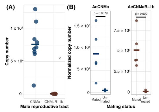 We expanded our expression analysis to include males, as previous transcriptomic datasets suggested that AeCNMaR-1a was expressed in male antennae [31,32]. We confirmed that AeCNMaR-1a is expressed in male antennae and was not detected in other tissues examined (Figure 3B). We found that AeCNMa was highly and specifically expressed in male accessory glands, but AeCNMaR-1b was not (Figure 4A). We next asked whether the expression of AeCNMaR-1b or AeCNMa was influenced by the mating status of females. We found that mated females had a significantly higher abundance of AeCNMa and AeCNMaR-1b than un-mated females (Figure 4B, p = 0.0079 and p = 0.009, Wilcoxon rank–sum test). We attempted to silence the expression of AeCNMaR-1a through injection of dsRNA into the thorax of female mosquitoes. While this approach successfully silenced the expression of other peptide hormone receptors in Ae. aegypti [10], we were unable to reduce expression of the AeCNMaR-1b or CNMa transcript through traditional RNAi (data not shown).