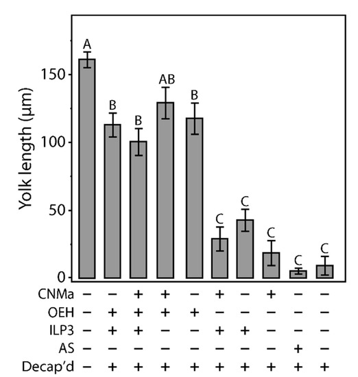 Given that AeCNMa suppressed egg production by mated female mosquitoes, we next investigated whether the influence of AeCNMa on Ae. aegypti egg production was related to interactions with AeOEH or AeILP3 [10,33,34]. Decapitation shortly after a blood meal blocked endogenous OEH and ILP3 release from the brain, and injection of AeOEH or AeILP3 restored egg development. We found that AeCNMa did not affect yolk deposition elicited by OEH, ILP3, or both peptides together (Figure 6). These results, along with the early window of CNMa action in mated females, suggested that the role of the peptide was independent of OEH and ILP3.