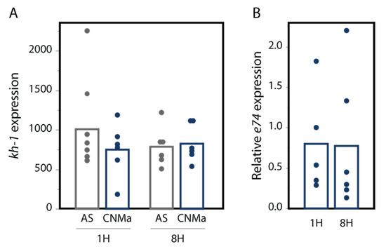 We also tested whether an injection of AeCNMa peptide into females resulted in changes in transcript abundance in the JH-responsive gene kruppel-homolog 1 (kh-1) or the ecdysteroid-responsive gene e74. We found no significant difference in their expression between female mosquitoes injected with AeCNMa or saline (Figure 7).
