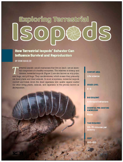 Only the teachers in the treatment group participated in the terrestrial isopod activities. The terrestrial isopod activities were from the articles “The Wonders of Terrestrial Isopods” [14] and “Exploring Terrestrial Isopods: How Terrestrial Isopods’ Behavior can Influence Survival and Reproduction” [15] (See Figure 2). All the terrestrial isopod activities that were used in the study were from the journal Science Scope, and some of the activities were aligned to the Next Generation Science Standards [16,17]. The terrestrial isopod activities presented information about terrestrial isopod biology and information about the ecological services terrestrial isopods perform in Earth’s ecosystems. The terrestrial isopod activities were initiated at the start of the semester directly after the pretest was given. They were then performed during the semester and were completed immediately before the post-test was given at the semester’s end. The terrestrial isopod species Porcellio scaber (see Figure 1) was chosen for the study because they are frequently bred in captivity; are readily available; can safely be used in a science classroom; can be bought in the U.S.; and can be easily combined into the terrestrial isopod activities that were used in this current study [14,15]. Additionally, this terrestrial isopod species and these terrestrial isopod activities were selected so that after the studies’ participants were taught how to use the curriculum, they could easily implement the curriculum in their classroom.