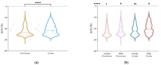 The supercooling point was significantly lower in the female than in the male O. excavata (−24.18 (−26.02~−20.07) vs. −23.21 (−25.15~−18.65) °C, p < 0.0001). The supercooling point was significantly lower in the female than in the male S. coma (−22.19 (−25.46~−18.38) vs. −20.65 (−23.85~−16.15) °C, p < 0.0001). Comparing across species, the supercooling point was significantly lower in the female O. excavata than S. coma (−24.18 (−26.02~−20.07) vs. –22.19 (−25.46~−18.38) °C, p < 0.0001), and, for males, the supercooling point was significantly lower in O. excavata than S. coma (−23.21 (−25.15~−18.65) vs. −20.65 (−23.85~−16.15) °C, p < 0.0001) (Figure 1b).