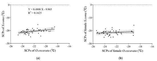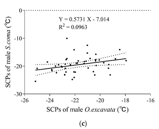 Overall, the supercooling points of S. coma and O. excavata were significantly positively correlated (r = 0.4031, p = 0.0041, n = 49) (Figure 2a). The supercooling points of S. coma significantly increased with that of O. excavata increasing (F(1, 47) = 9.120, R2 = 0.1625, p = 0.0041) (Figure 2a). The supercooling points of female S. coma and female O. excavata were not significantly positively correlated (r = 0.1761, p = 0.2260, n = 49) (Figure 2b). The supercooling points of male S. coma and male O. excavata were significantly positively correlated (r = 0.3103, p = 0.0300, n = 49) (Figure 2c). The supercooling points of male S. coma significantly increased with that of male O. excavata increasing (F(1, 47) = 5.008, R2 = 0.09629, p = 0.0300) (Figure 2c).