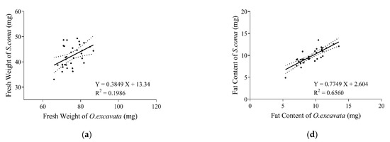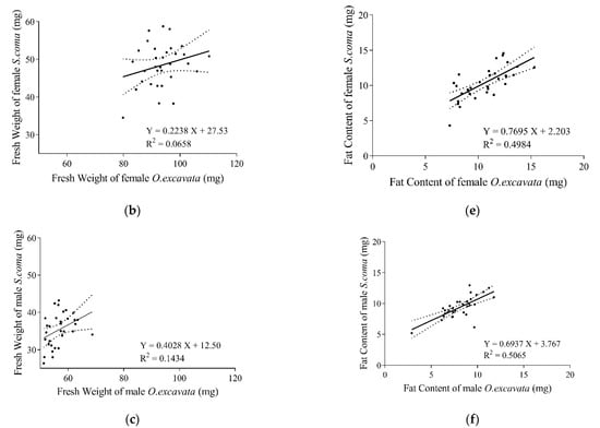 Generally, the fat contents of S. coma and O. excavata were significantly positively correlated (r = 0.8100, p < 0.0001, n = 32) (Figure 3d). The fat contents of S. coma significantly increased with that of O. excavata increasing (F(1, 30) = 57.22, R2 = 0.6560, p = < 0.0001) (Figure 3d). The fat contents of female S. coma and female O. excavata were significantly positively correlated (r = 0.7060, p < 0.0001, n = 32) (Figure 3e). The fat contents of male S. coma significantly increased with that of male O. excavata increasing (F(1, 30) = 29.81, R2 = 0.4984, p < 0.0001) (Figure 3e). The fat contents of male S. coma and male O. excavata were significantly positively correlated (r = 0.7117, p < 0.0001, n = 32) (Figure 3f). The fat contents of male S. coma significantly increased with that of male O. excavata increasing (F(1, 30) = 30.79, R2 = 0.5065, p < 0.0001) (Figure 3f).