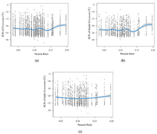 Influence of parasite ratio on SCPs of O. excavata in (a) general, (b) females, and (c) males. Points show the raw data. Blue lines represent the result of the generalized additive model. The shaded areas represent the 95% confidence interval.