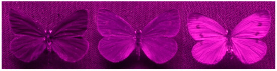 - Brues, C.T. Photographic evidence on the visibility of color patterns in butterflies to the human and insect eye. Proc. Am. Acad. Arts Sci. 1941, 74, 281–286. [Google Scholar] [CrossRef]