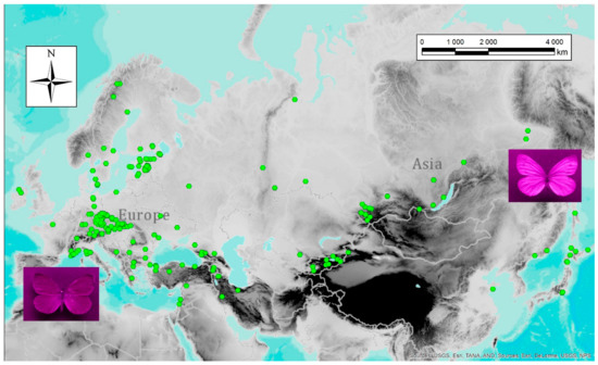 Locations of the 407 specimens of the green-veined white (Pieris napi) from the Palaearctic region from [61]. Female Pieris napi generally exhibit a less intense UV reflectance in western and southern regions of the Palaearctic.
