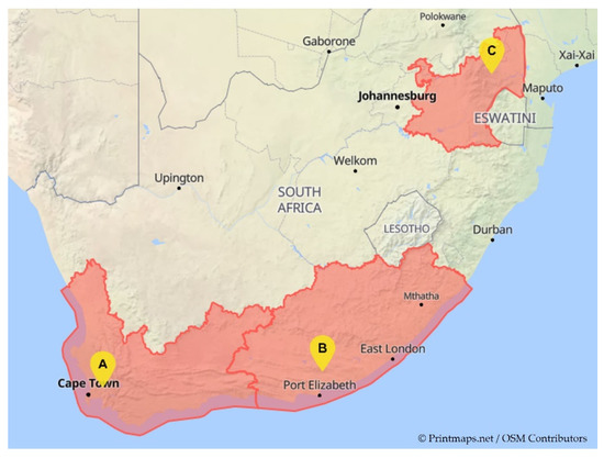 Figure 1. Citrus-producing regions across South Africa where T. leucotreta larvae were collected: (A) Stellenbosch in Western Cape, (B) Addo in Eastern Cape and (C) Nelspruit in Mpumalanga.