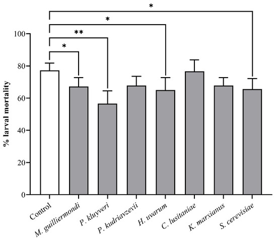 Figure 2. The mortality of T. leucotreta larvae, determined after 35 d on sterilised Navel oranges (n = 36), inoculated with yeast or left untreated. Data are shown as mean ± SE. * and ** indicate significant differences from the control according to a Fisher’s exact test (p < 0.05 and p < 0.01, respectively).