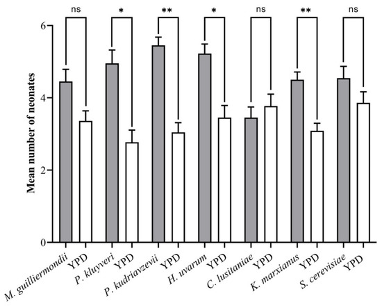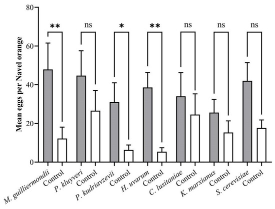 Figure 4. The oviposition preference of adult T. leucotreta females for yeast during two-choice tests (n = 10). * and ** indicate significant differences from the control according to a Student’s t-test (p < 0.05 and p < 0.01, respectively); ns indicates that differences were not significant.
