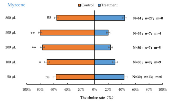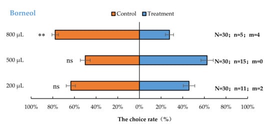 2.4. Olfactory Response of A. bungii Females to Four Synthetic Chemicals