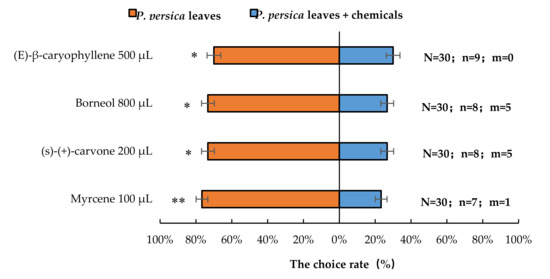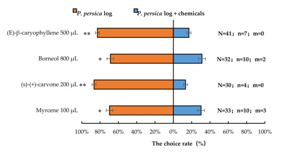 APA StyleCao, D., Liu, J., Zhao, Z., Yan, X., Wang, W., & Wei, J. (2022). Chemical Compounds Emitted from Mentha spicata Repel Aromia bungii Females. Insects, 13(3), 244. https://doi.org/10.3390/insects13030244