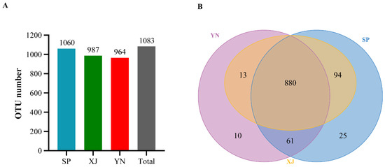 Figure 1 shows that 1060, 987 and 964 OTUs were obtained from three geographical populations of Spain (SP), Xinjiang (XJ) and Yunnan (YN), respectively (Figure 1A). Among these OTUs, 880 OTUs were shared among the gut microbiotas of the three geographical populations. There were 25 and 10 OTUs specific to the Spanish (SP) and Yunnan (YN) populations, respectively (Figure 1B).