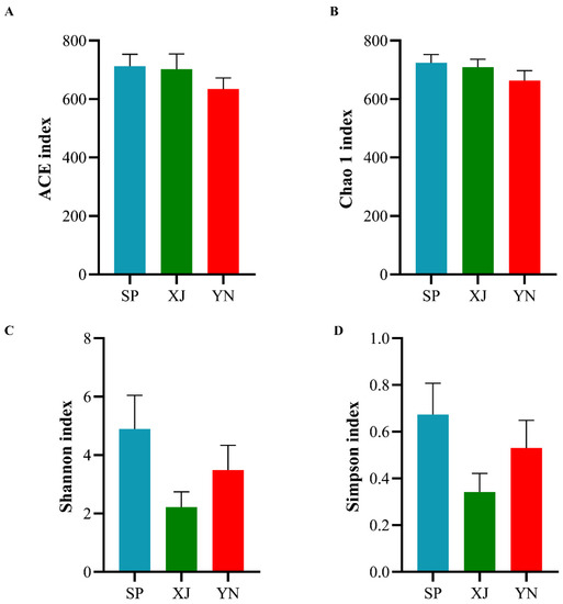 Analysis of alpha diversity indices of gut bacteria in T. absoluta from different geographical populations. Abbreviations: SP, Spain; XJ, Xinjiang; YN, Yunnan. (A) ACE index. (B) Chao 1 index. (C) Shannon index. (D) Simpson index.