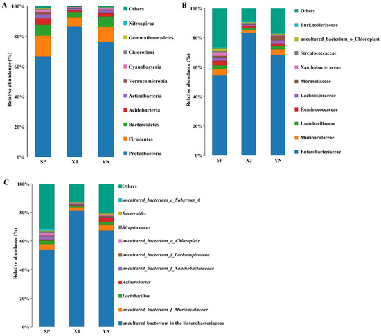 Species distribution in all samples. Abbreviations: SP, Spain; XJ, Xinjiang; YN, Yunnan. (A) Relative abundance of the top 10 bacteria at the phylum level in T. absoluta from three geographical populations. (B) Relative abundance of the top 10 bacteria at the family level. (C) Relative abundance of the top 10 bacteria at the genus level.