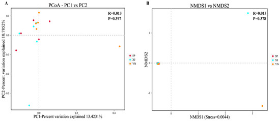 Beta diversity analysis of T. absoluta from different locations. Abbreviations: SP, Spain; XJ, Xinjiang; YN, Yunnan. (A) Principal coordinates analysis (PCoA) and (B) nonmetric multidimensional scaling (NMDS) based on the binary Jaccard distance. The reliability of NMDS with a stress value less than 0.2 is acceptable.