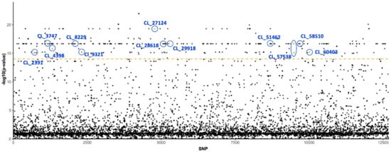SNPs and p-values from association test with insecticide resistance. The SNP index on y-axis is sorted by locus names and where they are located. Highlighted loci that host strongly segregated SNPs and their annotation are also presented in Table 2. Orange dashed line indicates the p-value cutoff (1 × 10−14) for association test.