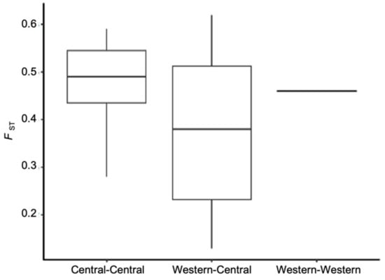 The percentage of polymorphic loci and observed and expected heterozygosity (Ho and He respectively) for all loci were estimated (Table 3). The TX Weslaco potato psyllid population was polymorphic at the highest percentage of loci (10%), while all other populations were polymorphic at 6 to 9% of loci. The average observed heterozygosity (Ho) among all populations ranged from 1.6 × 10−4 to 2.5 × 10−4, and the highest was observed in the TX Weslaco population. To examine variance in allele frequencies among populations and their degree of differentiation, we also measured the fixation index (FST) using the data set containing 4294 independent SNPs. The mean FST for all pairwise comparisons was 0.44. The TX Panhandle was, on average, the most differentiated from all other populations (mean FST = 0.52), and Western-2 was the least differentiated population (mean FST = 0.31) (Table S1). Surprisingly, pairwise FST of populations of Central haplotype were not significantly different from pairwise FST of populations that belonged to different haplotypes, e.g., Central and Western (t-test, p-value = 0.095, Figure 2, Table S1).