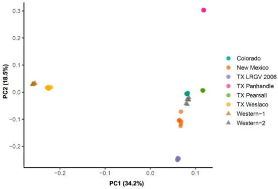 Further, the principal component 1 (PC1), which explained over 30% of the overall variation (Figure 3), separated the TX Weslaco and Western-1 cluster from the rest of the six populations. At PC2, TX LRGV 2006 and TX Panhandle diverged from the rest of the four populations, i.e., TX Pearsall, Colorado, Western-2, and New Mexico. The populations from New Mexico, Colorado, Western-2, and TX Pearsall grouped together. Similar to the FST results, we did not find that populations from the same haplotypes clustered together, e.g., Western-1 and Western-2 did not cluster together, and TX Weslaco was separated from the other Central haplotype populations.