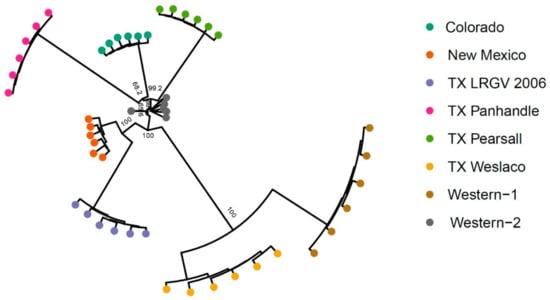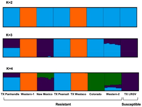 Moreover, Structure analysis indicated the most likely number of genetic clusters to be four (K = 4), based on the agreement between the ΔK method and estimators of the structure selector. At K = 2, Western-1 and TX Weslaco were placed in one cluster (Figure 4), and the rest of the six populations were placed in a different cluster. At K = 3, New Mexico and TX LRGV formed a new cluster that separated them from Western-1 and TX Weslaco. TX Panhandle and Western-2 seemed to be admixed between the TX Pearsall‒Colorado cluster and the New Mexico‒TX LRGV cluster. At K = 4, the Colorado samples separated and formed their own cluster, and Western-2 seemed to be most similar to Colorado while sharing some genetic similarities to TX Pearsall and TX LRGV. This pattern was consistent with the PCA outcomes. The overall pattern of the genetic structure indicated that populations of the same haplotype did not cluster together.