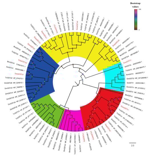 The open reading frames (ORFs) were predicted with ORF Finder (www.ncbi.nlm.nih.gov/orffinder accessed on 22 April 2020). The theoretical isoelectric points and molecular weights of the SzeaGSTs were predicted using the ExPASy server (www.expasy.org/tools/protparam.html accessed on 22 April 2020). The phylogenetic tree with a p-distance model and the pairwise deletion of gaps [32] was constructed using MEGA 7.0, while the bootstrap support of tree branches was assessed by resampling the amino acid positions 1000 times.