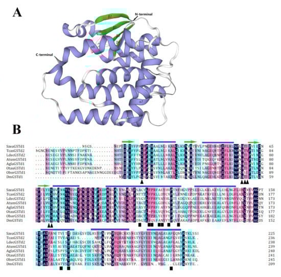 Amino acid sequence structure analysis of SzeaGSTd1. (A) The modeled 3D structure of SzeaGSTd1 (DmGSTd1 (Protein Data Bank ID: 3mak [47]) of D. melanogaster is the structural template). The α-helices and β-sheets were labeled with α and β, respectively. (B) Sequence alignment of delta-class GSTs from insects. Black triangles indicate amino acid residues that comprise the G site and black squares indicate the amino acid residues that comprise the H site. The position of β-sheets (β1-β4, indicated by the green arrow) and α-helices (α1-α8, indicated by the blue line segment) in the SzeaGSTd1 protein sequence is shown on top of the alignment. TcasGSTd2 from T. castaneum, QES86455.1; LdecGSTd2 from Leptinotarsa decemlineata, XP_023021411.1; AtumGSTd1 from Aethina tumida, XP_019870085.1; AglaGSTd1 from Anoplophora glabripennis, XP_018560761.1; OtauGSTd1 from Onthophagus taurus, XP_022909213.1; OborGSTd1 from Oryctes borbonicus, KRT81939.1; DmGSTd2 from D. melanogaster, NP_524326.1.