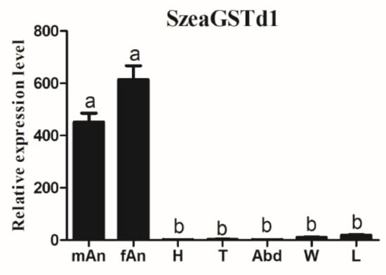 The relative expression levels of SzeaGSTd1 in different tissues. mAn: male antenna; fAn: female antenna; H: head; T: thorax; Abd: abdomen; W: wing; L: leg. The error bars represent the standard errors calculated from three replicates. Different letters on the error bars indicate significant differences analyzed by the ANOVA and HSD test (p < 0.05).