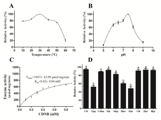 In the E. coli BL21, the recombinant SzeaGSTd1 was mainly expressed as soluble protein. The expected MW of recombinant SzeaGSTd1 (containing tags of expression vector pCold I) is approximately 28 kDa, and SDS−PAGE results indicated that the SzeaGSTd1 was shown as an estimated 28 kDa single band (Figure S2). At pH 7.5 and 30 °C, recombinant SzeaGSTd1 exhibited optimum catalytic activity (Figure 4A,B). At the GSH concentration of 1 mM, the CDNB-conjugating activities of SzeaGSTd1 in response to different concentrations of CDNB were determined, and the kinetic parameter was analyzed according to the Michaelis–Menten plot (Figure 4C). The Vmax was 1047 ± 43.09 μmol/mg/min, the Km was 0.42 ± 0.04 mM, the catalytic number Kcat was 444.97 s−1, and the catalytic efficiency (Kcat/Km) was 1.06 × 104 s−1 Mm−1.