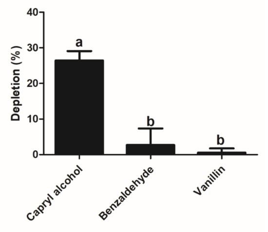 The degradation abilities of recombinant SzeaGSTd1 for capryl alcohol, benzaldehyde, and vanillin. Error bars represent mean ± S.D. of three independent experiments conducted in three replicates. Different letters on the error bars indicate significant differences identified by ANOVA and HSD tests (p < 0.05).