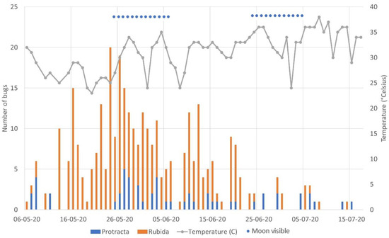 Number of bugs captured nightly from 6 May 2020 through 17 July 2020 along with nightly temperature and moon visibility.