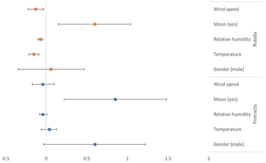 The only factor that significantly increased the number of T. protracta was moon visibility (log-count = 0.85, 95% CI: 0.22, 1.48, p-value = 0.01). While not statistically significant, an increase in temperature contributed to an increase in the expected log-count of male T. protracta while wind speed and relative humidity had a negative impact on their capture number (Table 1). In the case of T. rubida, all factors except sex were statistically significant. Increases in temperature, relative humidity, or wind speed negatively affected the quantity of this species, while light from the moon increased the expected log-count (Table 1) and 95% confidence intervals (Figure 2).