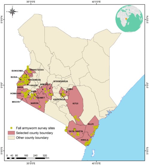 Deployment and fine-tuning of such sustainable FAW control options for optimal performance requires an understanding of current smallholder agronomic management strategies and livelihood factors and how these different factors are likely to interact, to inform on best ways to adopt them through a farming system approach and taking into consideration potential trade-offs [20,21]. Because of diverse, biophysical and socio-economic contexts in areas invaded by FAW, there is a need to assess the agronomic factors to understand their distribution, influence on FAW infestations, damage and interactions with potential agro-ecological sustainable solutions for FAW management. Thus, the objectives of this study were to: (1) assess FAW infestation and damage levels in smallholder maize cropping systems across different agro-ecological zones in Kenya; (2) determine agronomic factors influencing FAW infestation and damage in smallholder maize cropping systems in Kenya; and (3) assess the magnitude of the co-occurrence of FAW and stemborers in smallholder maize cropping systems in Kenya.