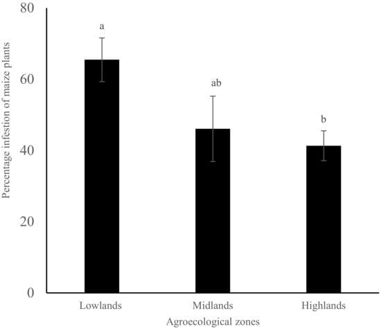 Percentage of maize plants infested (mean ± SE) by fall armyworm in different agro-ecological zones of Kenya. Bars capped with different letter differ significantly (Tukey’s studentized test: p < 0.05).