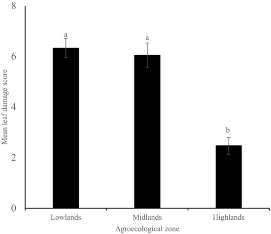 Mean fall armyworm damage score (± SE) on leaves of maize plants in three different agro-ecological zones of Kenya. Bars capped with different letter differ significantly (Tukey’s studentized test: p < 0.05).