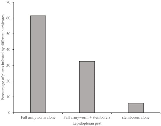 Vegetative maize crops can recover from FAW damage, especially if the crop is growing rapidly. However, impacts of heavy damage levels and late detections of infestations may lead to irreversible damage [10]. Previous studies have reported the maize leaf damage score by FAW in Kenya to range from 3.2 to 5.3 on the Davis damage scale [11]. Fall armyworm cause similar damages and occupy the same ecological niches as lepidopteran stemborers, such as B. fusca, S. calamistis and C. partellus [12]. These lepidopterans are interacting with and amongst each other, especially at the larval stage in the utilization of crop resources, being mainly maize, which is their preferred host plant [12,13]. Given that these herbivore pests have similar feeding guild, host plant and phenological characteristics [14,15], competitive interspecific interactions are likely to occur. These multi-faceted interactions will persist as FAW and stemborers continue to co-occur on several widely cultivated plants. Such interactions are likely to influence community structure of these lepidopteran herbivores in areas where they co-exist. Recently, field studies in maize and sorghum cropping systems in Uganda revealed that the invasion of FAW has caused the decline of stemborer incidences and the displacement from the maize crop, as their preferred host plant, to sorghum [16]. Assessing interactions and co-occurrence across different agro-ecologies is critical to inform the best pest management strategies to be deployed.