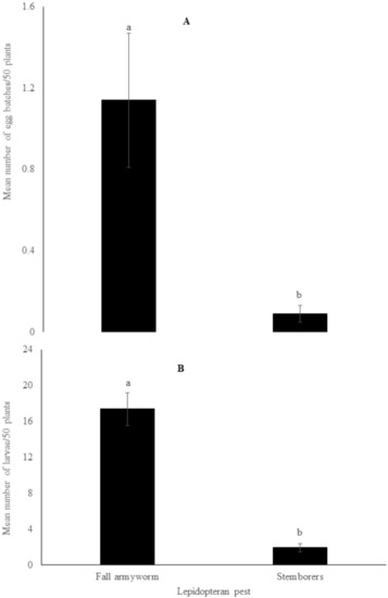 Mean number (mean ± SE) of egg batches (A) and larvae (B) of fall armyworm and stemborers per 50 maize plants observed during field survey in Kenya. Bars capped with different letter differ significantly (Tukey’s studentized range test: p < 0.05).