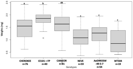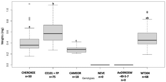 Significant differences were found in the larval weight of A. pisum alfalfa biotype (LSR1 clone) reared on the different Pisum genotypes (Figure 2). No surviving nymph was observed on two P. sativum genotypes (NEVE and AeD99OSW- 49-5-7), and the lowest larval body mass was observed on P. sativum genotype CAMEOR (0.32 ± 0.09 mg). The nymph with the highest body mass was observed on CE101 = FP genotype (0.59 ± 0.18 mg) while CHEROKEE (0.49 ± 0.18 mg) and the P. fulvum genotype WT304 (0.49 ± 0.18 mg) displayed similar intermediate body mass.