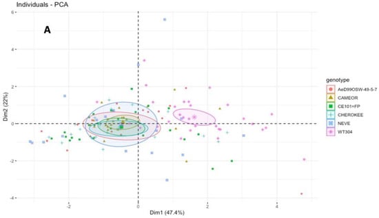 All statistical analyses were performed using the Rstudio software version 1.4.1717 (The R Foundation, https://www.r-project.org/, accessed on 30 January 2022). Data on aphid body mass were analyzed using a one-way ANOVA, and post-hoc comparisons using DGC test (Di Rienzo, Guzman, Casanoves), p < 0.05. EPG-derived parameters were analyzed using a non-parametric analysis of variance (Kruskal-Wallis), since their distribution did not follow normal law. Pairwise comparisons were made when the p value was inferior to 0.05, 0.01, or 0.001. For some parameters, the Mann–Whitney U rank sum test was carried out to point out differences between Pisum genotypes for each aphid biotype. To visualize how the different Pisum genotypes influence the feeding behavior of the pea- and alfalfa-adapted A. pisum clones, we conducted a principal component analysis (PCA) on a selection of EPG parameters that exhibit significant differences between Pisum genotypes. PCA was run for each biotype separately using the FactoMineR package. Axes with an eigenvalue >1 were considered and the first two dimensions with the highest loadings being selected.